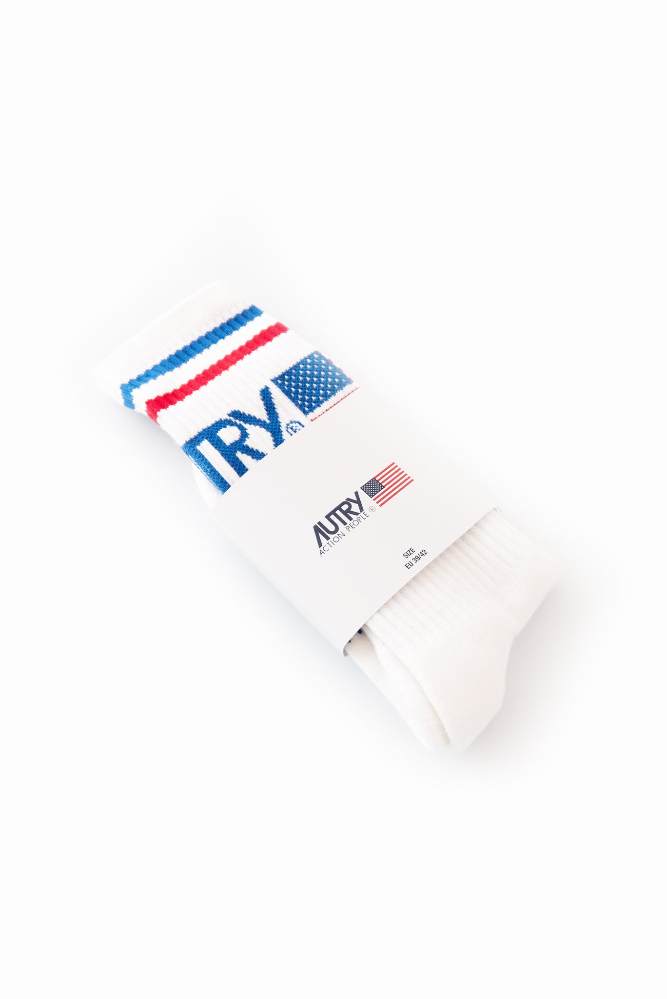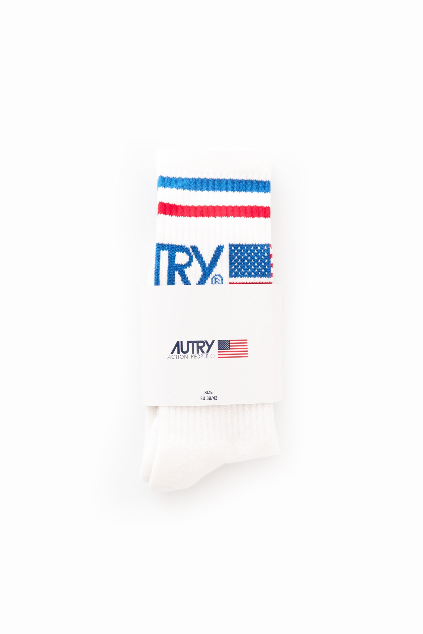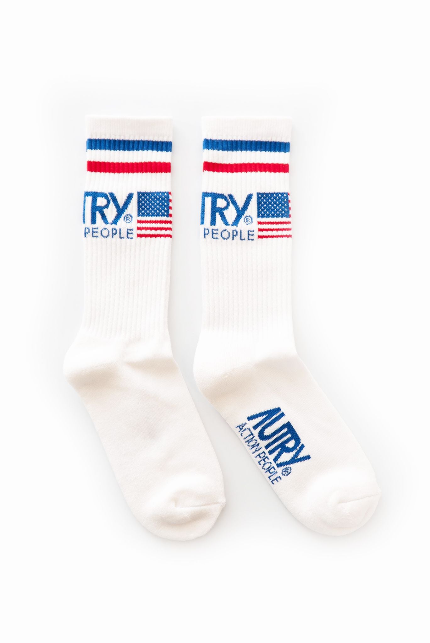 Righe blu e rosse con logo Autry sul gambale.