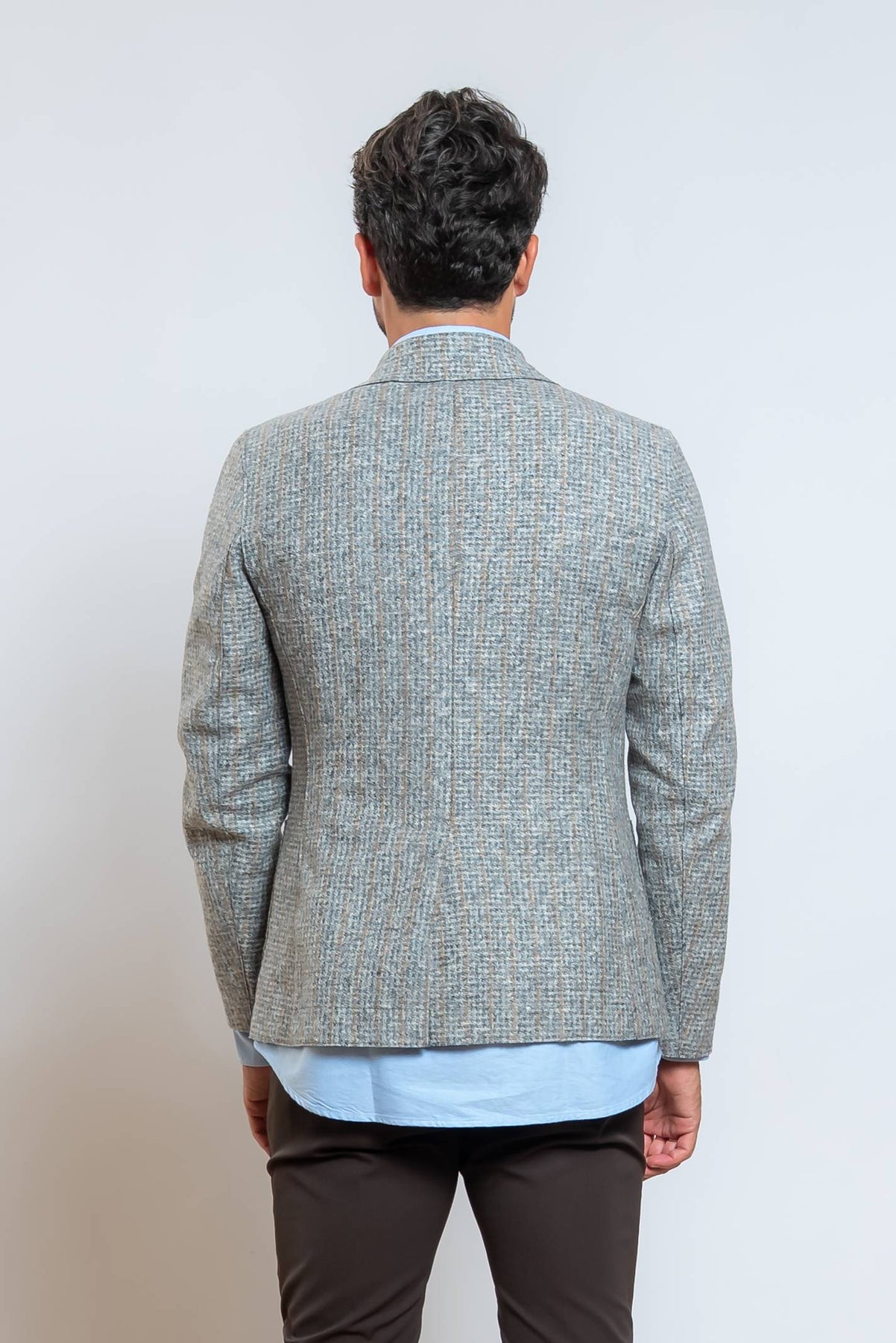 Giacca monopetto in maglia grigia con fantasia gessata sui toni del beige