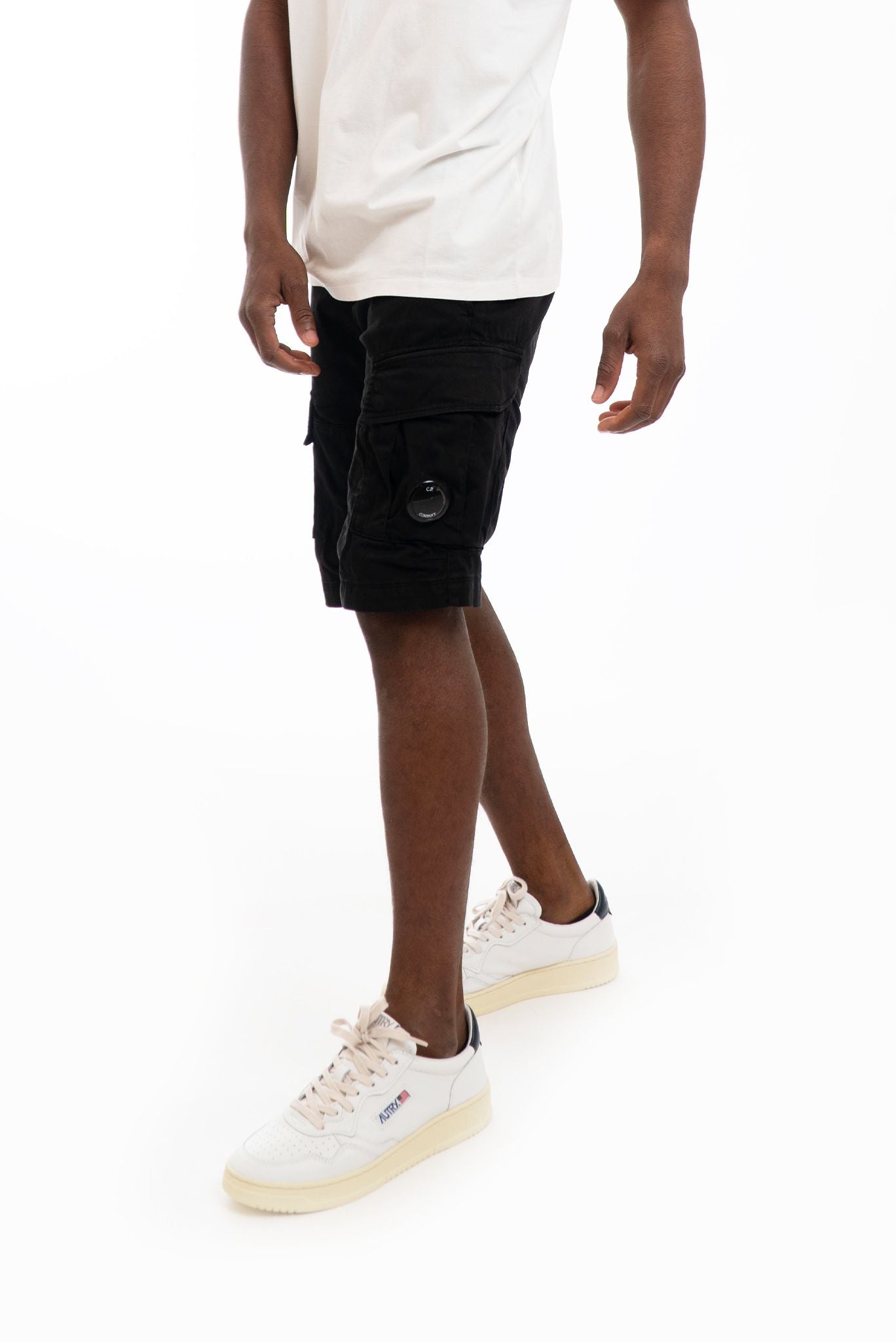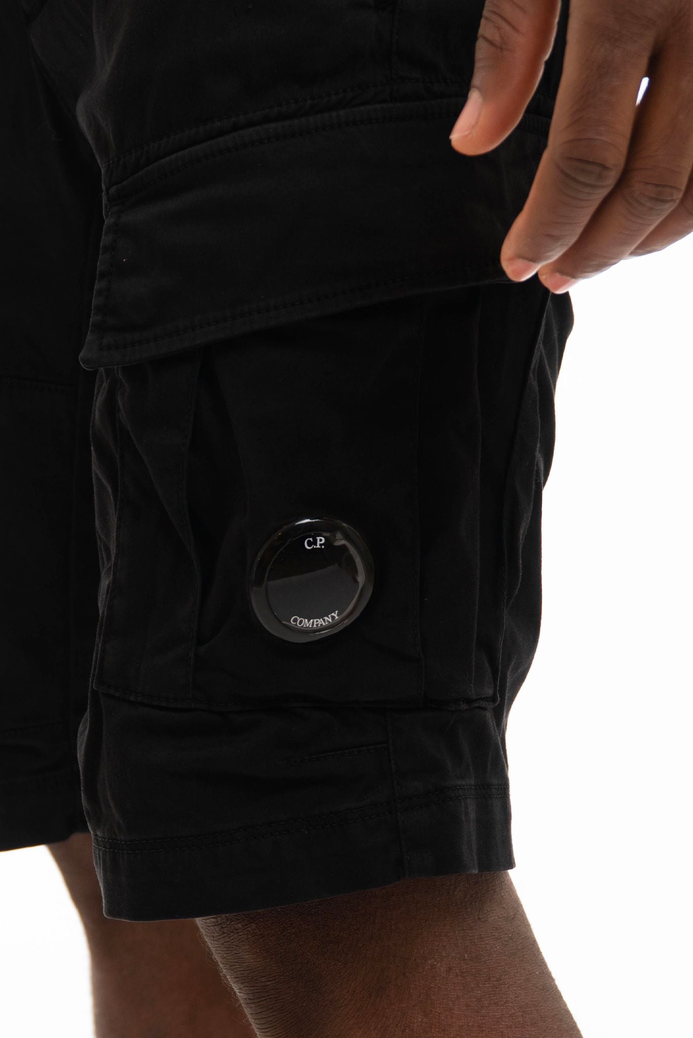 Tasconi tipici del modello cargo con pattina e bottoni a scomparsa. Lente C.P. Company applicata sulla tasca sinistra.