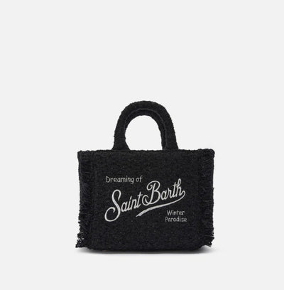 Borsa realizzata in tweed nero Logo Saint Barth ricamato sul davanti Orli con frange Chiusura con zip Tasca interna Tracolla removibile e regolabile 20 x 19 x 10 cm