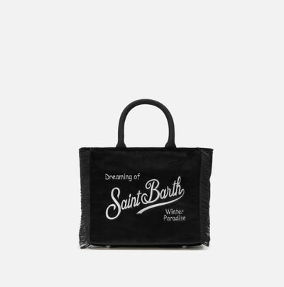 Borsa realizzata in velluto nero Logo Saint Barth ricamato sul davanti Orli con frange Chiusura con zip Tasca interna Tracolla removibile e regolabile 20 x 19 x 10 cm