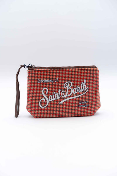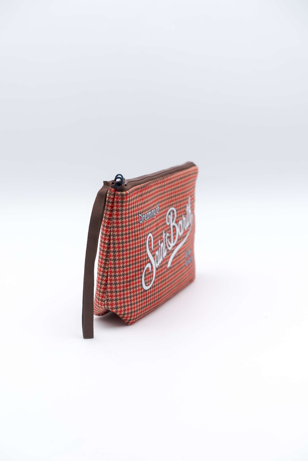 Pochette in velluto a fantasia pied de poule sui toni del rosso, beige e marrone