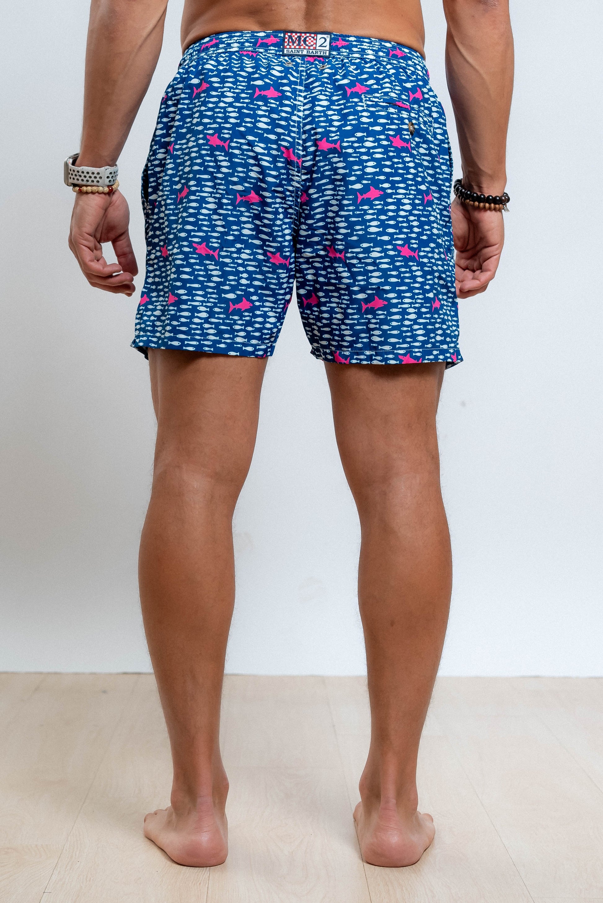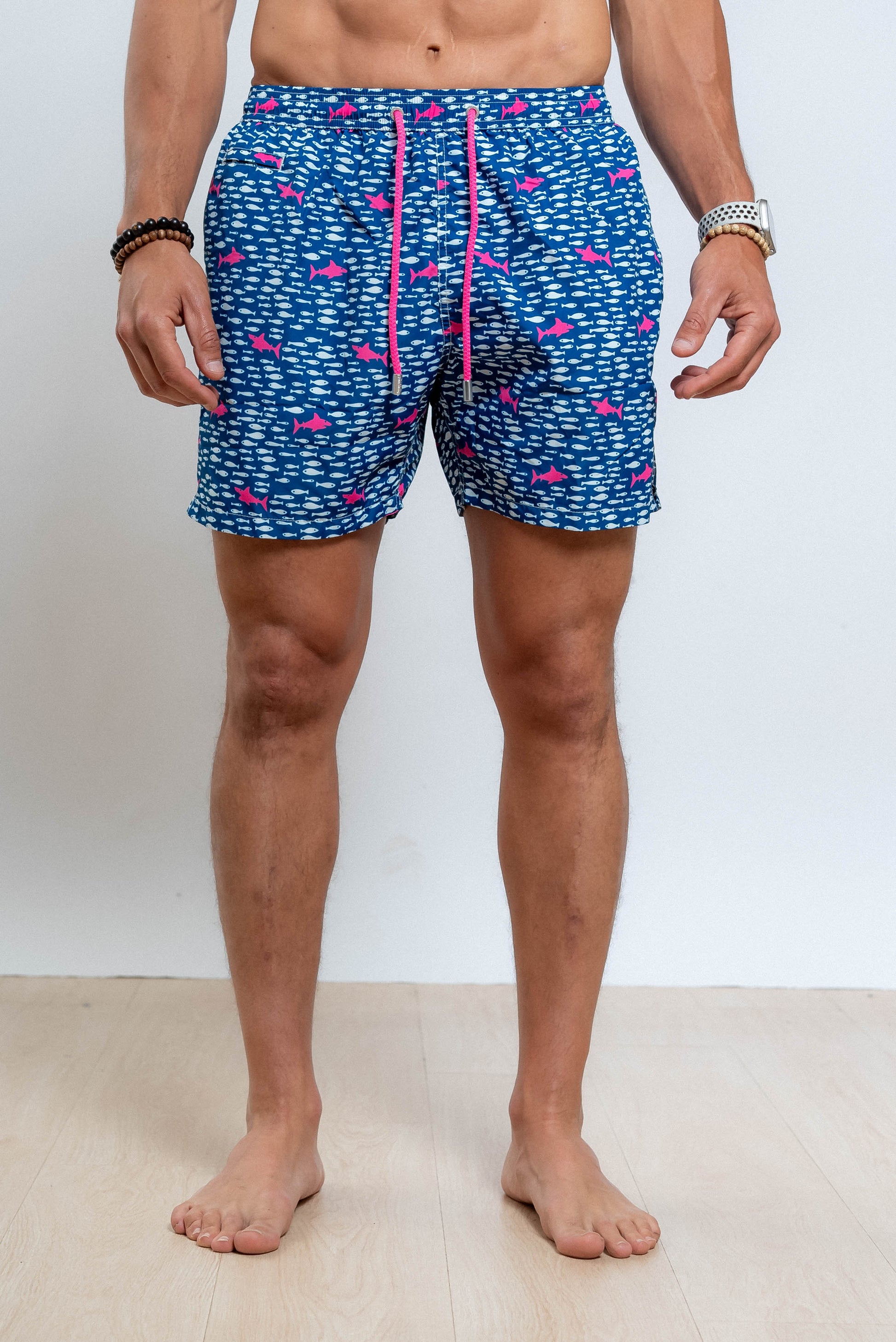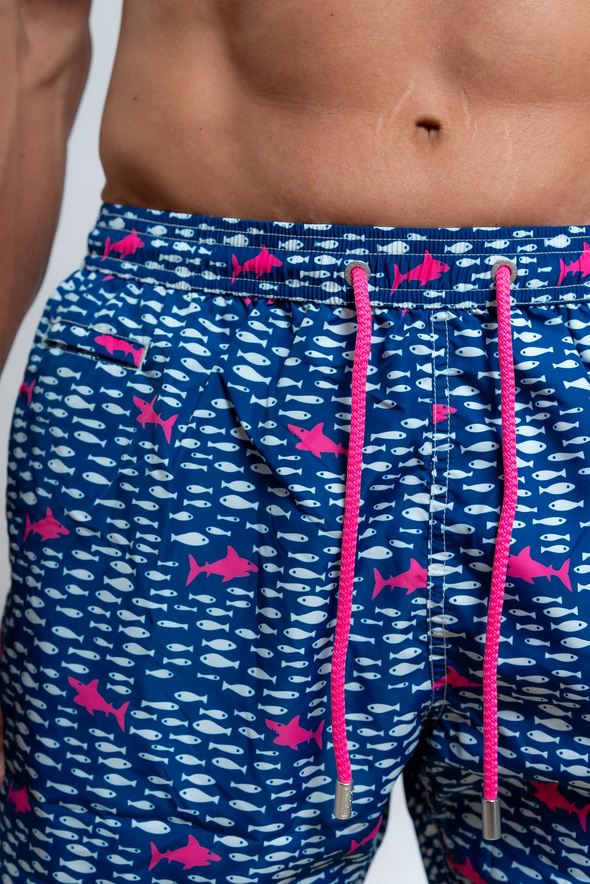 Base blu con mini stampa squali bianchi con dettagli fucsia
