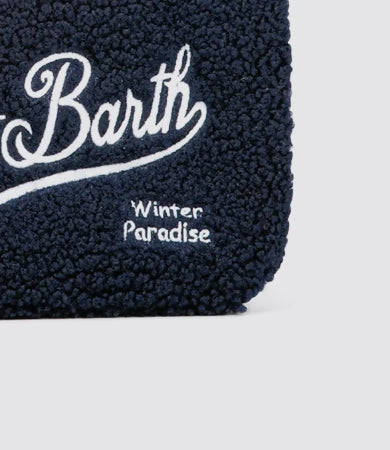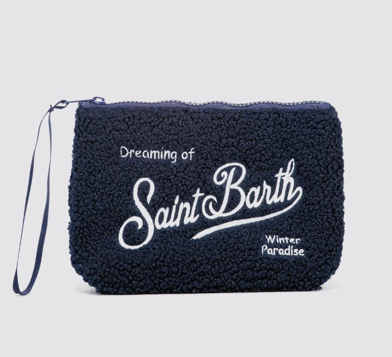 Pochette realizzata in tessuto teddy bluLogo ricamato sul davantiInterno in neopreneChiusura con zipTirante da polso