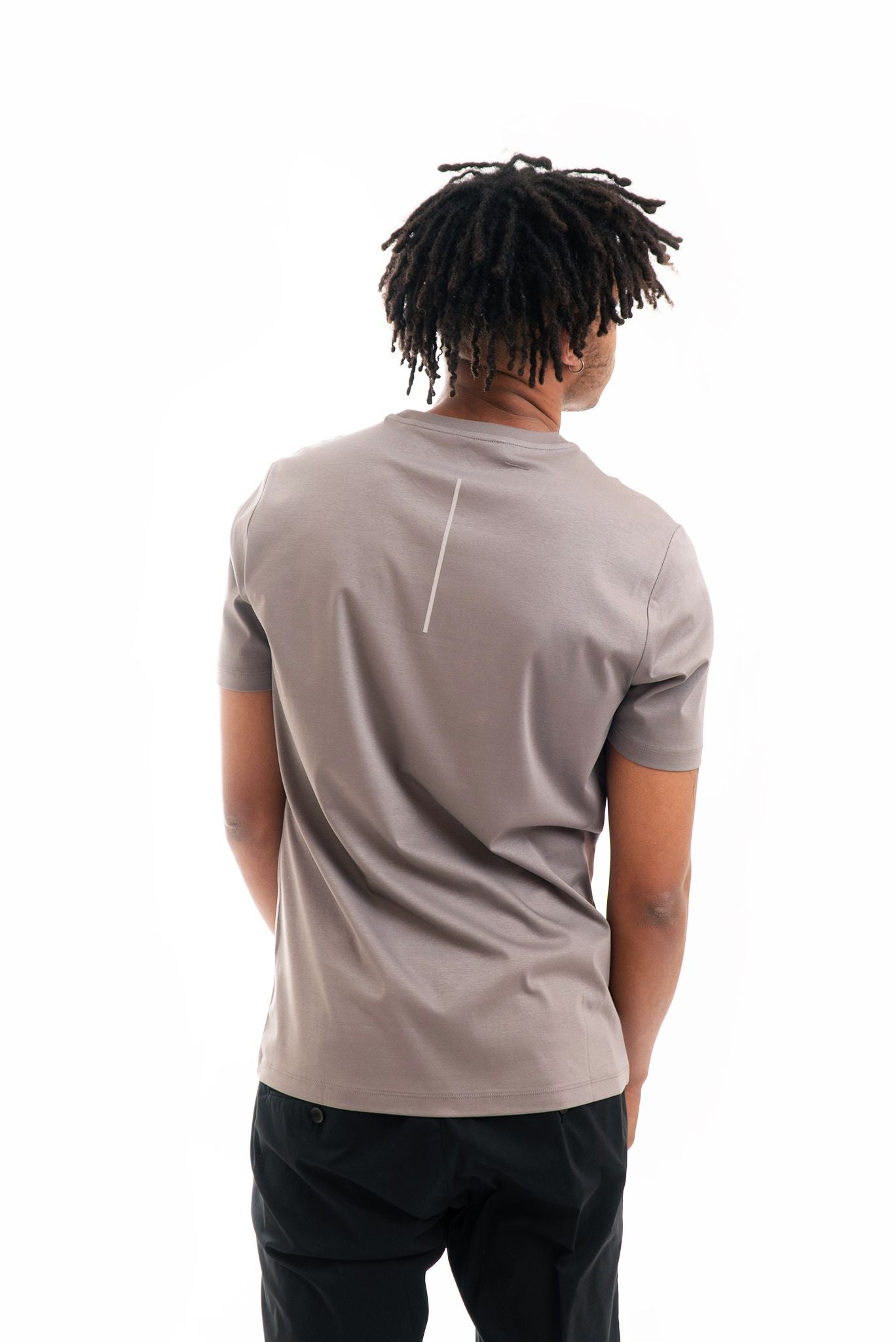 T-shirt grigia effetto filo di scozia, con girocollo a costine.