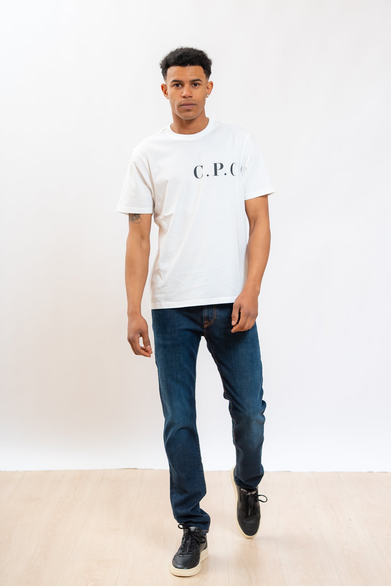 Modello cinque tasche con bottoncini bronzo logati.